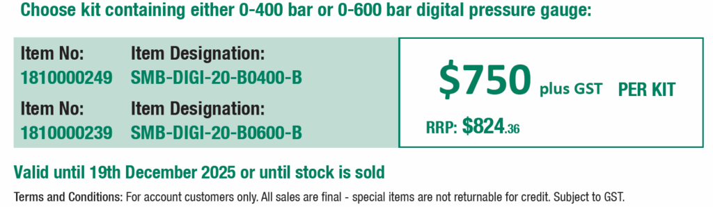 Choose kit containing either 0-400 bar or 0-600 bar digital pressure gauge: